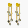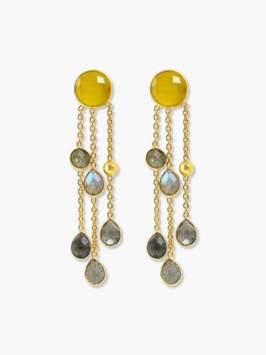 Elevate your look with these stunning dangle earrings featuring yellow chalcedony and labradorite gemstones. These statement earrings are crafted from high-quality 925 silver with a gold plating finish, these earrings are designed with delicate chains to showcase the beauty of the stones. The elegant design and unique combination of gemstones make these earrings a perfect statement piece for any occasion.