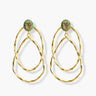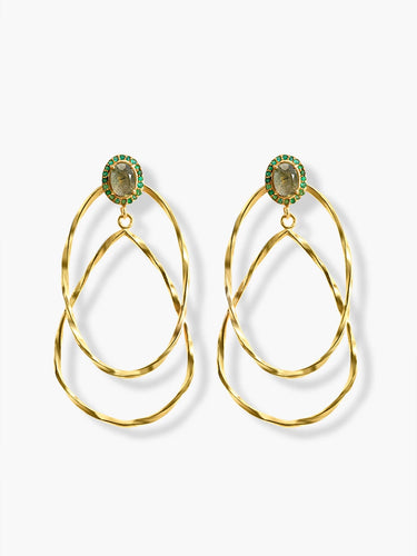 Meet one of our best-selling gold plated sterling silver double oval hoop statement earrings. These stunning earrings feature an upper section adorned with an oval Labradorite stone surrounded by multiple small round green onyx stones. The iconic design includes a large oval hoop and a large tear drop hoop attached to the Labradorite stone. The large oval hoop gracefully hangs above the tear drop hoop, creating a beautiful and unique style.