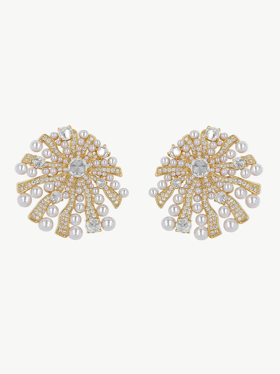These statement stud earrings feature a striking blend of radiant zirconia crystals and luminous pearl stones, designed to add instant glamour to your evening look. Bold yet refined, they are perfect for parties, night outings, and special occasions where effortless elegance is a must.